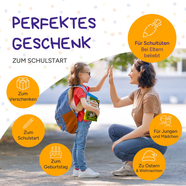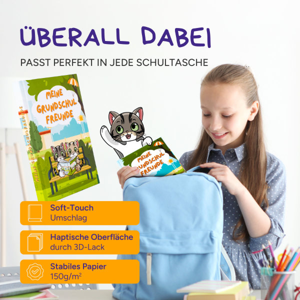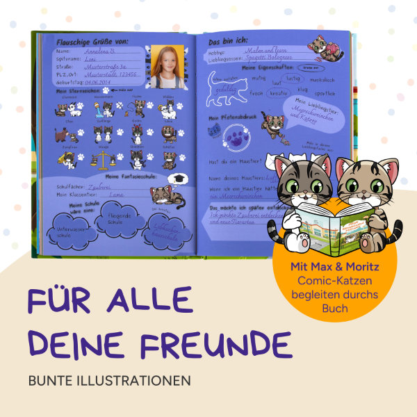Das Freundebuch „Meine Grundschulfreunde“ ist ideal für Kinder von 6 bis 11 Jahren und begleitet sie liebevoll durch die gesamte Grundschulzeit. Die zwei Comic-Katzen Max & Moritz führen spielerisch durchs Buch und machen das Ausfüllen zu einem Erlebnis. Ob im Schulranzen oder in der Freizeittasche – dieses Freundebuch für die Schule passt überall hinein. Mit seinem kindgerechten Design, der weichen Haptik und dem Fokus auf die Klassen 1 bis 4 ist es der perfekte Begleiter, um Freundschaften in der Grundschule festzuhalten.